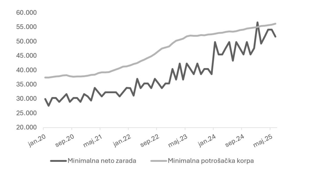 Pre nego što uđemo u raspravu o platama i posledicama, važno je napomenuti da minimalna zarada ima vrlo ograničen domet, pa su joj ograničene i makroekonomske posledice. Trenutno, prema zvaničnim podacima, minimalac obuhvata oko 90.000 radnika, odnosno približno 3,8% zaposlenih. Ne govorimo, dakle, o povećanju „svima redom“, već o korekciji na donjem rubu raspodele. Uz to, kada minimalnu zaradu uporedimo sa minimalnom potrošačkom korpom, vidi se da je većinu godina rasla sporije od osnovnih troškova života. Kao na Grafikonu 1, linija minimalca uglavnom je ispod linije korpe; povremena približavanja bila su kratka. Zato povećanje koje stupa na snagu 2026. pre svega predstavlja delimično hvatanje koraka sa troškovima, a ne iznenadni skok standarda niti potez koji sam po sebi može proizvesti makro „katastrofu“.