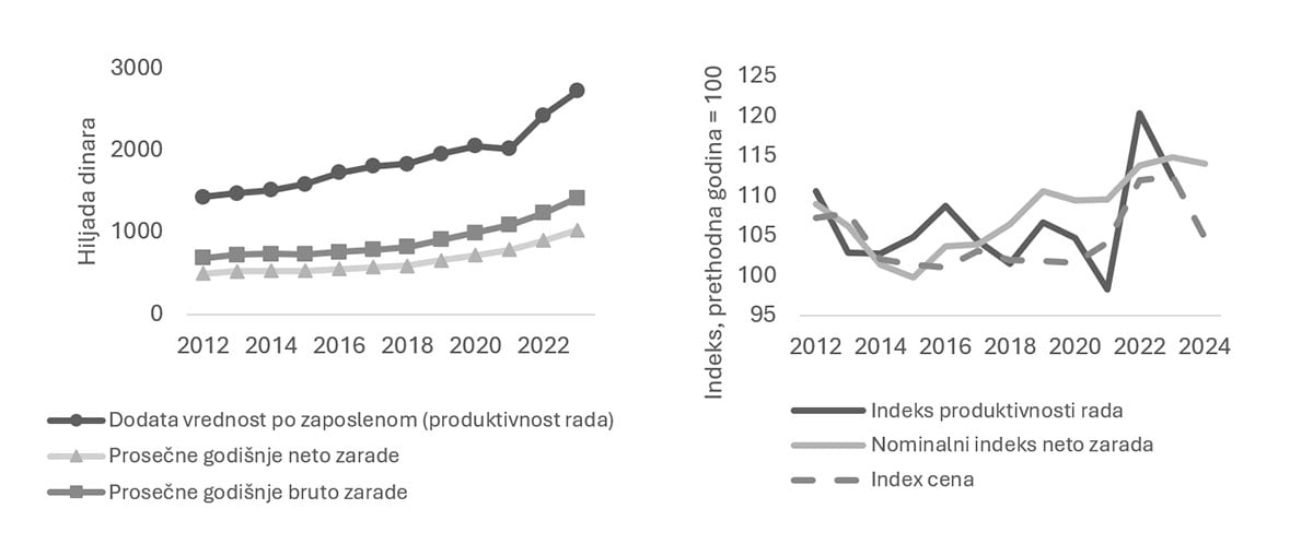 Od 2021. godine plate su određeni period rasle brže od produktivnosti. To je uglavnom bio efekat oporavka nakon kovida i zategnutog tržišta rada, a ne skok efikasnosti. Taj kratkotrajni nalet vidi se na Grafikonu 2 (desno), gde nominalni indeks neto plata privremeno prelazi indeks produktivnosti u 2021-2022, a zatim se smiruje. Drugim rečima, kratki sprint na vrhu dugotrajnog zaostajanja. U relativnim terminima, jaz se samo blago suzio: dodata vrednost po zaposlenom pala je sa 2,08 puta više od prosečne bruto plate 2012. na 1,92 puta 2023. godine. U apsolutnim terminima, produktivnost i dalje ubedljivo nadmašuje plate.