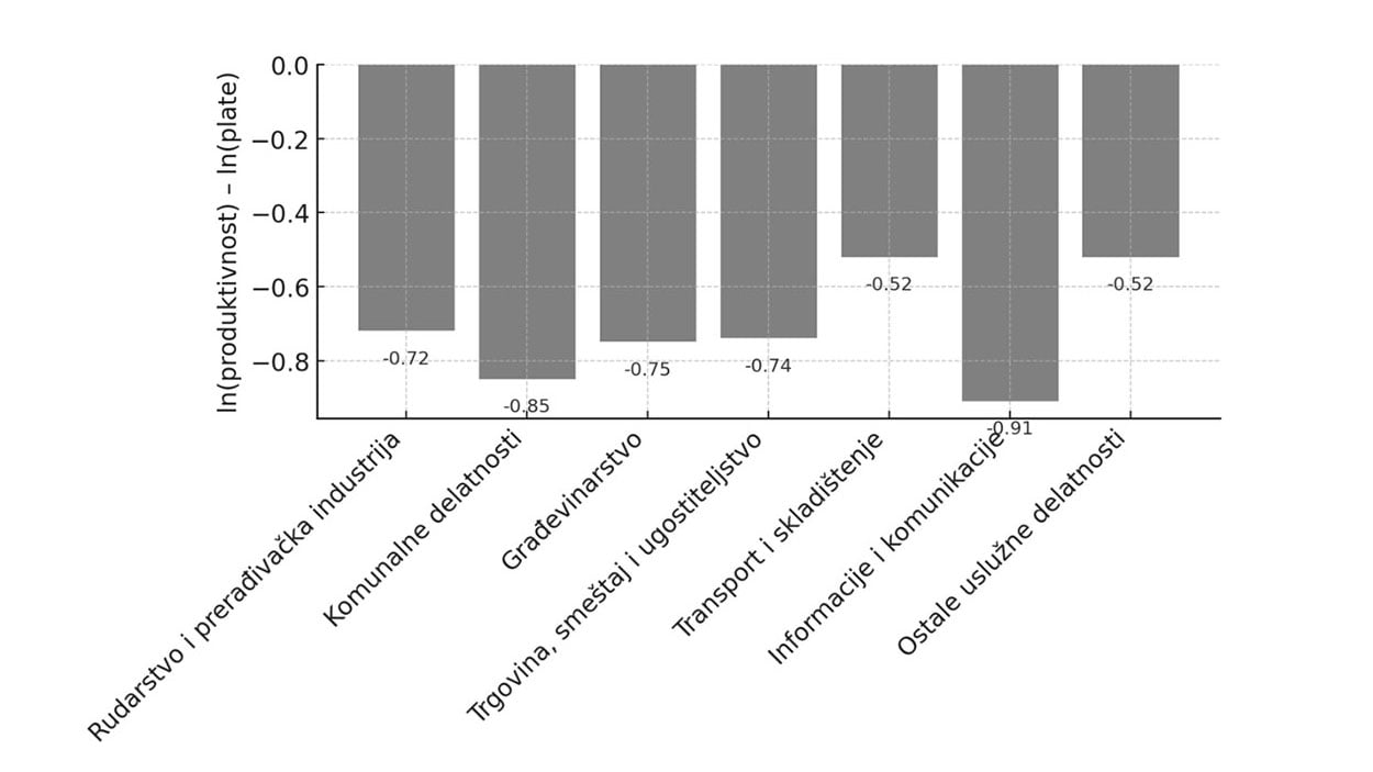 Sektorska struktura prikazana je na Grafikonu 3: sve vrednosti su negativne (ln produktivnost – ln plate), što znači da su zarade niže od produktivnosti, a najveći jaz postoji u kapitalno intenzivnim delatnostima. Posebno se izdvaja sektor informacionih i komunikacionih tehnologija (IKT) – ironično, upravo onaj koji Srbija često promoviše kao svoj motor rasta. IKT ima i makroekonomski značaj: reč je o ključnom izvoznom sektoru (oko 30% izvoza usluga i približno 10% ukupnog izvoza). Kada vodeći izvozni sektor beleži veliki jaz između plata i produktivnosti, problem nije samo u raspodeli dohotka, već i u slabljenju izvozne osnove koja bi trebalo da nosi dugoročni rast.