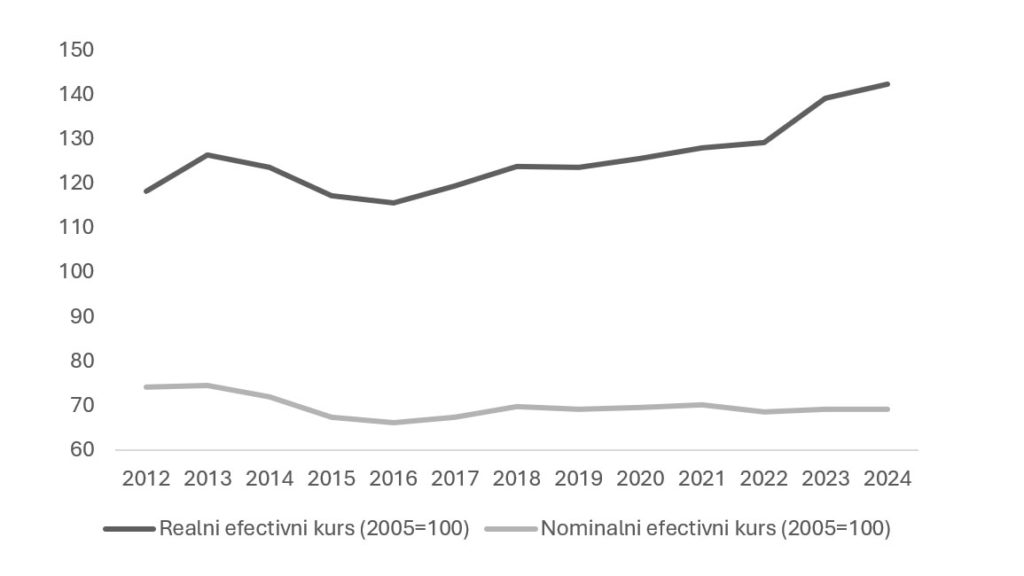 Srbija primenjuje režim upravljanog fluktuiranja kursa. Vrednost dinara se formira na tržištu, dok Narodna banka interveniše samo da ublaži prevelike oscilacije, a ne da brani fiksni nivo. Grafikon 4 pokazuje zašto to i dalje opterećuje izvoznike. Nominalni efektivni kurs (NEER) – ponderisani prosek vrednosti dinara prema valutama glavnih trgovinskih partnera – ostao je uglavnom stabilan. Realni efektivni kurs (REER) koriguje isti pokazatelj za inflaciju kod nas i u inostranstvu. Kada cene u Srbiji rastu brže nego kod partnera, REER raste čak i ako se nominalni kurs dinara gotovo ne menja.
