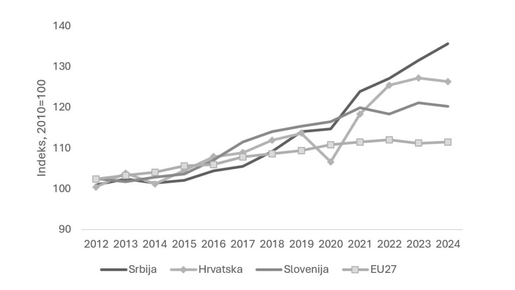 Zašto, onda, produktivnost ne stiže plate? Ne zato što su srpski radnici lenji; naprotiv. Produktivnost rada u Srbiji ubrzala je poslednjih godina. Tokom većeg dela prethodne decenije rasla je sporije nego u Sloveniji, Hrvatskoj i EU27, ali je od oko 2018. godine počela da ih sustiže i prestiže. Zbirno gledano, do 2024. produktivnost rada u Srbiji dostigla je oko 1,35 puta nivo iz 2010, dok je u Hrvatskoj iznosila oko 1,26, a u Sloveniji 1,2 (Grafikon 5).